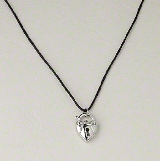 The cord is a waxed cotton, short length of 16 inches, with a lobster claw closure. Charm does NOT unlock, is attached to the cord with a jump-ring.